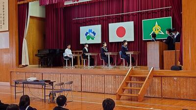 前半は、生徒会組織の詳しい説明と、専門委員会の流れ、朝自習や図書室の利用の仕方、テストの受け方の説明など学校生活改善のために委員会活動が主体的に活動することの意義についての話がありました。