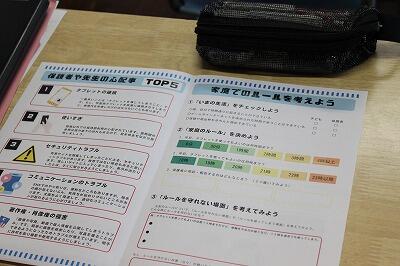 スマホ・タブレットの上手な使い方を考えるために、一番多い使い道、トラブル、使用時間、使用場所などの意識のズレをチェックしました。そして保護者や先生の心配事トップ5とうことで、タブレットの破損、使い過ぎ、セキュリティトラブル、コミュニケーショントラブル、著作権・肖像権の侵害について学びました。最後に、リーフレットを使って家族と相談して、家庭でのルールを作るための方法を確認しました。