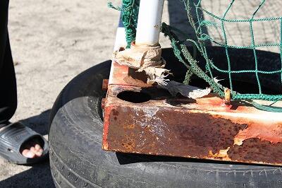 学校施設の安全点検で、グランドに設置してあるハンドボールのゴールポストのうち、北側のポストが、老朽化により溶接部分が外れたり、錆びついていたりして、このままでは使用ができないことがわかりました。修理が完了するまでのしばらくの間、使用禁止となりました。