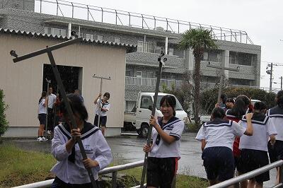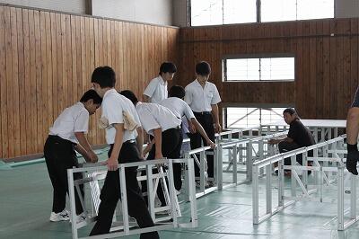 会場は地区体育館で、作業内容はシート引きからスタートして、ステージづくり、展示用のパネルや机・椅子の搬入が中心でした。ステージの部材やパネルが外部の倉庫に収納してあったので、そこからの搬出でした。その際に、あいにくの雨となりました。しかし、そこはさすがの3年生で、雨にも負けず、頑張って搬出やパネルの組み立、机・椅子並べを最後まで頑張ってくれました。一つの地域貢献ができました。