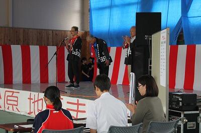 10月20日(日)は、小松原地区体育館を会場にメイン祭りが開催されました。ステージで行われたオープニングでは、本校吹奏楽部が、県吹奏楽コンクール銀賞受賞の実力を十分に発揮した、迫力のあるサウンドを響かせていました。放送の進行も、本校放送委員の3名で、地域の方からは声の響きの良さが大好評でした。午後の部のステージには、本校女子生徒によるカラオケ出演もあり、一人で堂々と歌声を披露していました。