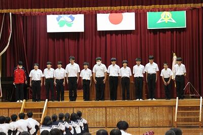 その後、激励式に移り、表彰された2つの部と、地区予選大会がなく県大会が最初になる男子ハンドボール部を加えた3つの部が、県中学校秋季体育大会に向けた決意表明を行ってくれました。