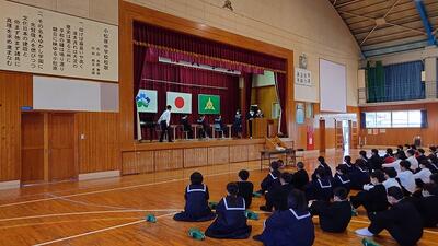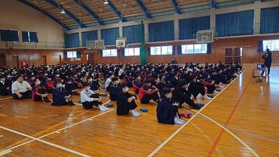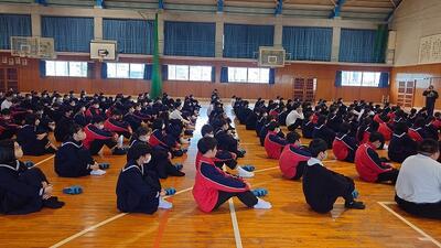 4月11日(火)3校時に全校一斉に交通安全集会が行われました。生徒会生活委員会が中心となり、自転車の安全な運転の仕方、交通マナーについて学びました。ヘルメット着用についても紹介がありました。