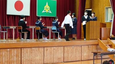 12日(水)の5・6校時に2・3年生徒1年生との対面式が行われました。