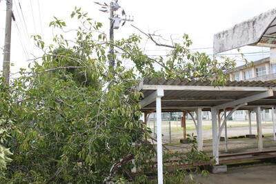 台風が通り過ぎた後、校舎内の点検をしたところ、雨漏りやガラスの破損など、特に被害はありませんでした。しかしながら、自転車小屋横の桜の木が根元から大きく倒れ、幹の一部が自転車小屋の屋根を突き破ってしまいました。さらにテニスコートの桜やグランドの木も一部枝が折れるなどの被害がありました。台風の風力の凄まじさに驚くばかりです。