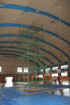 8月7日(月)~16日(水)にかけて体育館の照明をLEDに交換する工事が行われています。以前よりも明るくなったり、スイッチON後すぐに点灯したりなど、かなり改善されるのではないかと期待しています。