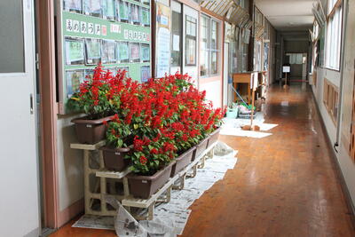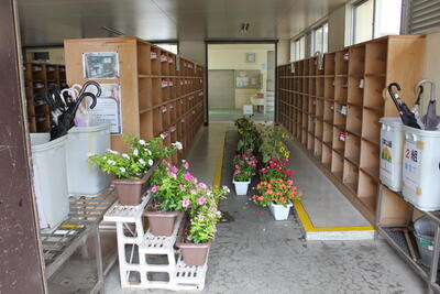 台風6号は強風と豪雨を伴いながら九州西側を移動していきました。人権の花などが植わった学校のプランターは、職員室前廊下や、下足室に早々と非難させました。