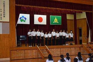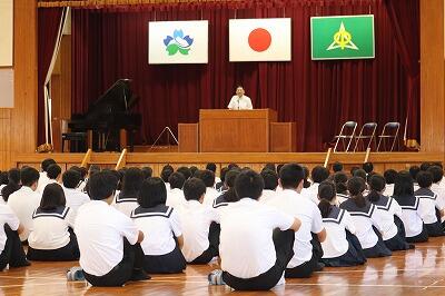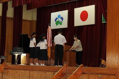 始業式では、各学年の代表3名が2学期に向けての目標を発表してくれました。また式の後には、全日本少年少女(銃剣道)錬成大会での個人敢闘賞や県新人ソフトテニス大会団体優勝の表彰が行われました。