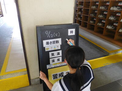 本校では、夏場から暑さ指数を測定、保健体育委員会が専用掲示板に示して熱中症への注意を促しています。この活動もまだまだ継続が必要なようです。