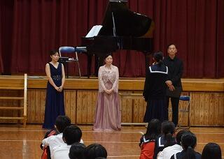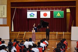 9日(木)に鑑賞教室が開催されました。ソプラノ歌手の河野幸子さん、バリトン歌手の山下友輔さん、ピアノ伴奏の内田春香さんの3名が来校され、「声楽の世界」という題名で、響きのある素晴らし歌声と演奏を聴くことができました。また小松原中学校の校歌を二部合唱に編曲していただき、それを全校生徒で歌うこともできました。