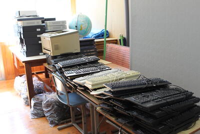 本校パソコン室に配置されていた使用できなくなった生徒用のディスクトップパソコンや校務用のノートパソコン、プリンターなど100点ほどの廃棄パソコン等機器の回収が行われました。すでに生徒一人一人にタブレットのChromebookが配付されていますので、今後パソコン室に新たなパソコンが導入されることはないと思われます。パソコン室は集会や個別指導、会議等に活用しています。