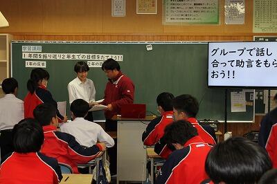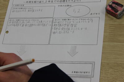 始めに、この1年間の目標を確認、頑張ったこと、良かったこと、悪かったこと、できなかったことを思い出し、自己採点をしました。それを受け、2年生で達成したい目標と具体的な対策を考え、グループで発表し内容の共有をしました。かなり具体的に考えており、2年生になる自覚をもつことができたようでした。
