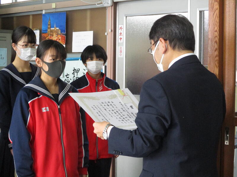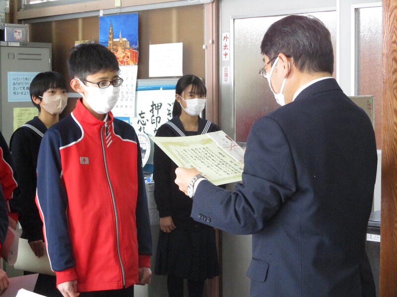 12月22日(木) 終業の日に先立ち、2学期に様々な分野で活躍した生徒の表彰を行いました。新型コロナウイルス感染症の防止と寒波への対応で、明日の終業式がリモート開催となるため、全校生徒の前ではなく校長室での表彰式となりました。