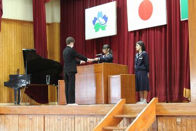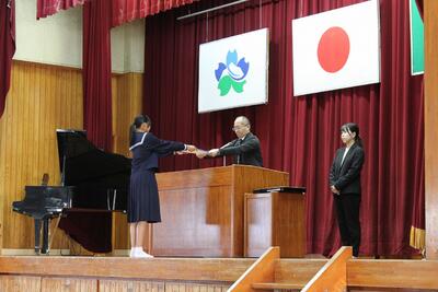 ◇ 表彰:日頃の学習の成果を称えて 式に先立ち、学習委員会主催の「学習コンクール(計算力)」の表彰が行われました。満点を獲得した生徒たちの努力が形となり、会場からは大きな拍手が送られました。