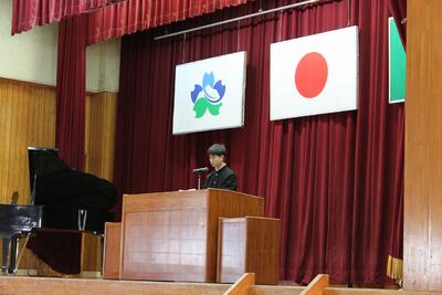 校長先生からは、大王小学校の卒業式に参列した際、児童の礼儀正しさや合唱に感動したエピソードが紹介されました。「素晴らしい後輩たちが来月入学してきます。小松の森に掲示されている『感謝力』を胸に、謙虚さと素直さを忘れず、周囲から応援される先輩になってほしい」と、新学年に向けた心構えについてお話がありました。