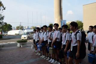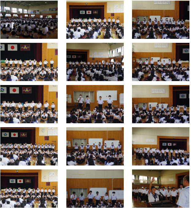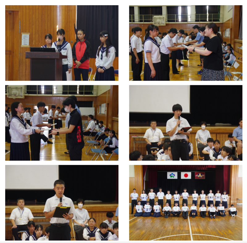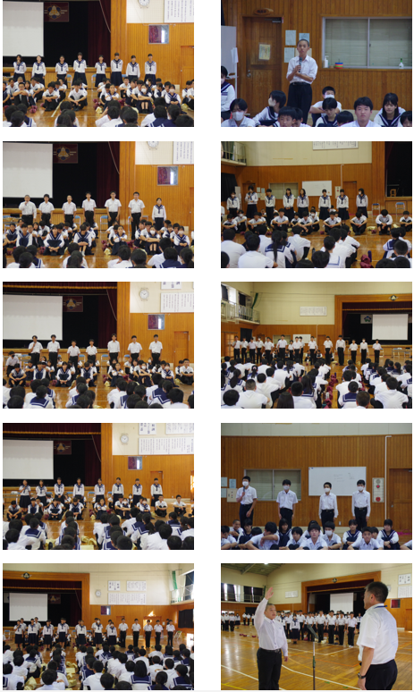 22日(火)は1学期終業の日でした。大清掃の後、オンライン形式で表彰、終業式、夏休みの諸注意等を行いました。終業式では各学年と生徒会代表の4人の生徒が、1学期を振り返っての作文を発表しました。配信用のビデオカメラを前に緊張していた様子でしたが、4人の生徒は堂々と発表していました。校長先生のお話や諸注意では、夏休みの過ごし方について、特に命を守ることについて話がありました。オンラインの最後には、九州大会に出場する男子バレー部、男子ソフトテニス部(個人戦)の推戴式を行い、全校で激励しました。一人一人の生徒にとって、楽しく充実した夏休みになることを願っています。