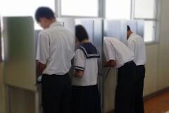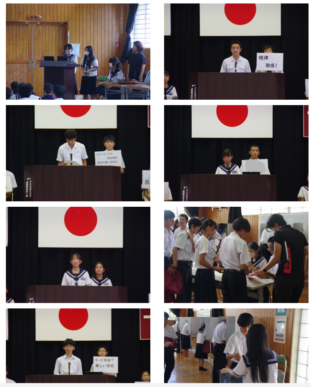 本日の午後、生徒会役員選挙が行われました。オンラインで1・2年生の立候補者・応援者の演説を各学級に配信して、演説を聴きました。そして、各学年ごとに投票を行いました。どの生徒も自分の一票を託す立候補者を真剣に選んで投票していました。今回の選挙の準備・運営を担ったのは、3年生を中心とする選挙管理委員会のメンバーです。自分たちで考えて行動する姿はすばらしいものでした。市の選挙管理委員会から本物の記載台と投票箱をお借りして実施した今回の選挙は、生徒にとって、民主主義や選挙の意義を学ぶ主権者教育の場にもなりました。