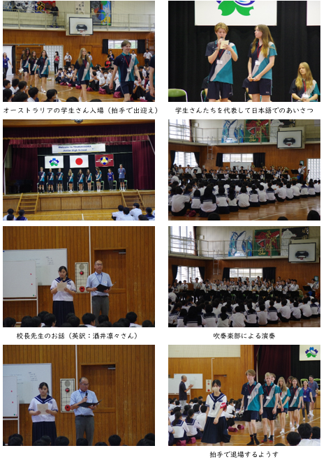 生徒会執行部の司会進行のもと、まず、全校生徒の拍手でオーストラリアの皆さんが入場されました。校長先生のあいさつは、先日行われた都北地区中学生英語暗唱・弁論大会で第2位に入り、県大会出場を決めている2年生の酒井さんに英語で伝えてもらいました。