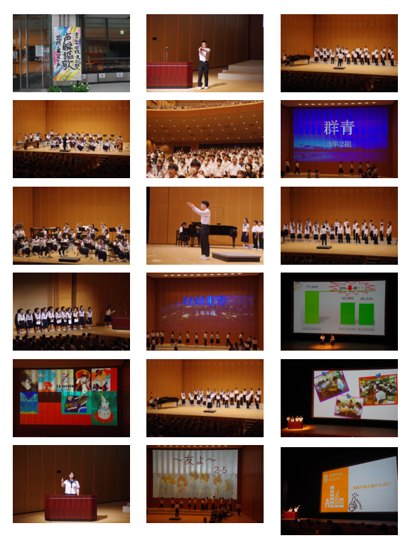 本日、都城市総合文化ホール(MJ)大ホールにて、文化祭が行われました。たくさんの保護者の皆様にご観覧いただきありがとうございました。今日を迎えるまでに文化祭実行委員会をはじめとして、たくさんの方々の関わりにも大変感謝いたします。午前中は、積み重ねた合唱練習の成果を披露してくれた各学級の子どもたち、吹奏楽部や美術部の皆さん、都北地区英語暗唱弁論大会に出場した皆さんの発表でした。弁当昼食後、午後は3年生が総合的な学習の時間で取り組んだ地域の課題についての改善策を、学年代表の5グループの皆さんが発表してくれました。
