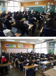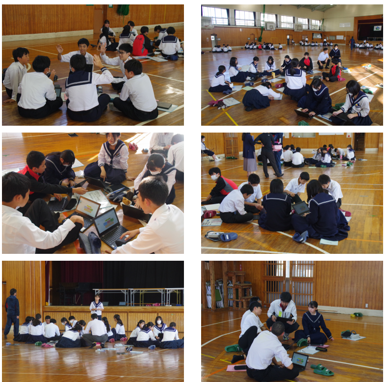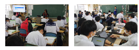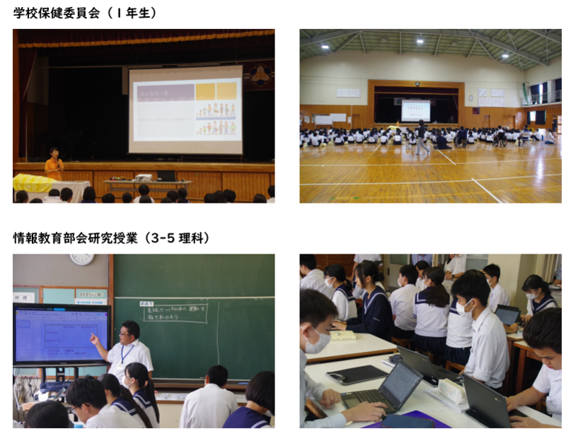 1-1社会、1-5保健、2-2社会の研究授業を行いました。一人一台端末を活用し、Googleスライドやfigjamなどで協働的な学習が行われていました。研究授業以外のクラスは英語の疑問詞のプリント演習とキュビナ学習を実施しました。UCTメンバーによる下級生への解説なども行われました。