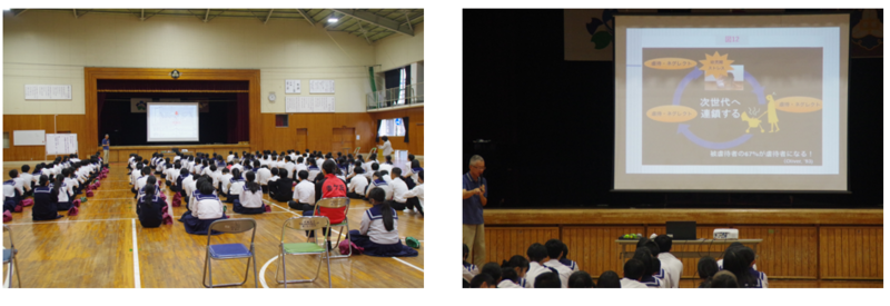 ・被虐待者の67%が虐待者になる(子どものころに虐待を受けた子は大人になって虐待をする可能性が高くなるという研究結果が出ています。このことを生徒の皆さんにお伝えすることで、虐待のない世の中を作っていきたいという思いがあります)