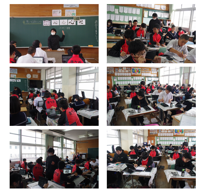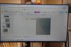 5校時の研究授業参観の間、生徒自身の取組で学力向上を図る学力向上タイムが行われました。生徒会役員が学年ごとに教科を決めて手作りの学習プリントを作成して準備をしました。1年生は社会科の学習が行われ、それぞれの生徒がプリントを解いた後、生徒会役員が教師役となってモニターを使いながら解説を行いました。後半は、一人一台端末を使ってキュビナ(AIドリル)に各自が取り組みました。