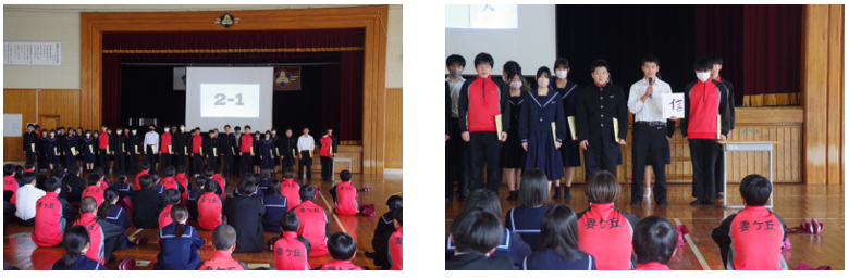 生徒会任免式では、選挙管理委員会の皆さんの進行で進められました。旧生徒会への感謝状贈呈のあと、旧生徒会長の吉留は開口一番、全校生徒への感謝を述べ、新生徒会への任命証授与のあとの新生徒会長の岩谷さんからは今、この場に立ってとても緊張しているが、皆さんと一緒に素晴らしい妻ケ丘中を皆さんとともに作っていきたいとの決意表明がありました。この日出張で不在となった校長先生からの動画メッセージを受け取り、旧生徒会から引き継いだバトンを新生徒会がこれからどのようにつないでいくのか、妻ケ丘中の全校生徒の皆さんに大いに期待しています。