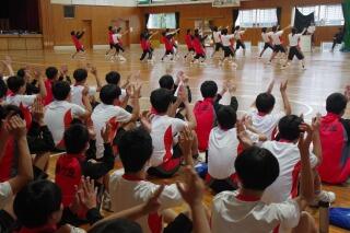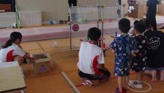 日本文化体験2では、教室で作った紙飛行機を体育館で飛ばすクラスや鬼ごっこなどの外遊びをするクラス、20秒で書いた絵が何かを当てるゲームや風呂敷の包み方を行うクラスなど、それぞれの学級で楽しく交流が行われていました。