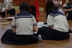 本日の生徒活動は、全校専門委員会の前期まとめを体育館で行いました。今週で生徒会役員や学級組織が新しく変わるため、前期の取組の良かった点、後期の取組に引き継ぐ点について委員会ごとに集まって話し合いました。また、全校専門委員会と同時進行で25日(土)の都城市戦没者慰霊祭で奉納する千羽鶴の準備をしました。初めて鶴を折る生徒も多く、生徒会のClassroomにアップされた動画を見ながら、生徒達は一羽一羽思いを込めて丁寧に鶴を折っていました。