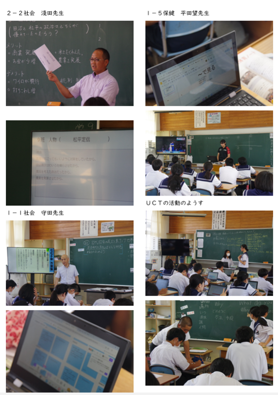 1-1社会、1-5保健、2-2社会の研究授業を行いました。一人一台端末を活用し、Googleスライドやfigjamなどで協働的な学習が行われていました。研究授業以外のクラスは英語の疑問詞のプリント演習とキュビナ学習を実施しました。UCTメンバーによる下級生への解説なども行われました。