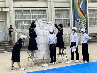4月19日(水)の5時間目に結団式を行いました。全校生徒が見つめる中、全校保体委員長を中心に準備したあみだくじを団長が選び、風船の色を決めました。その風船を割ると、色のついた紙吹雪が入っており、その紙吹雪の色がその団の団色という流れでした。工夫を凝らした面白い団色決定でした。本日20日(木)より、各団の練習や団装飾の準備が始まります。全員で力を合わせ、すばらしい体育大会になることを願っています。