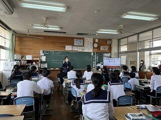 6月16日(金)午後、3年生の総合的な学習の時間に都城市地域振興課の種子田主幹及び妻ケ丘地区まちづくり協議会の堀川会長をお呼びし、お二人に地域活性化に向けた都城市及び妻ケ丘地区の取組や課題について説明をしていただきました。