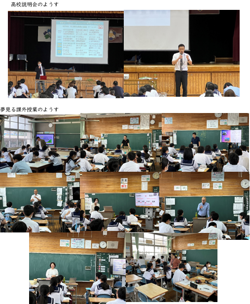 3年生は県内私立高校より先生方にお越しいただき、1回目の高校説明会、2年生は地元企業のご協力で夢見る課外授業を行いました。3年生においては今後の進路選択に生かすべく、各高等学校の先生方の説明に熱心に聞きいっていました。また、2年生においては、職業人による講話と、聞いてきたことを持ち寄って子どもたちで情報交換する場を持ちました。都城高専および県立高校説明会は7月7日に開催します。