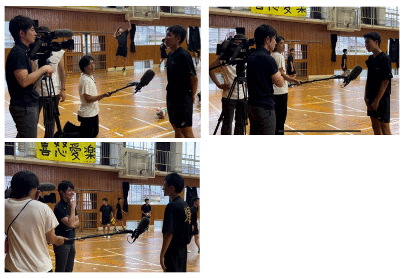 生徒たちは、初めての取材で、ずっと緊張している様子でした。しかし、藤﨑アナウンサーやカメラマンさん、音声さんの声かけもあり、次第に笑顔もでてきて、いつもの男子バレー部らしさを出せるようになりました。卒業生も来てくれ、試合をする様子も撮影されました。