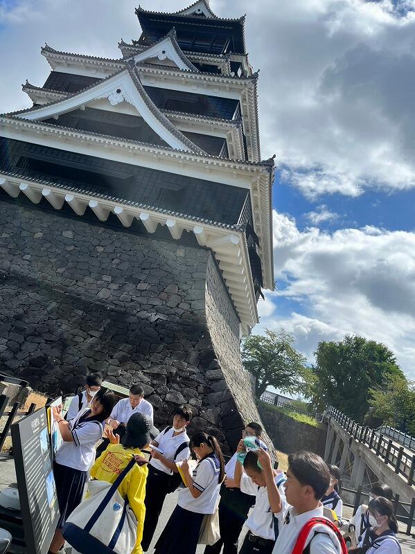 生徒たちは、熊本城が修復中の様子を見学しながら、その歴史についても熱心に勉強していました。