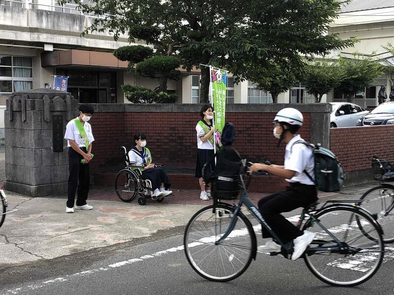 朝のあいさつ運動を実施しました。のぼり旗やたすきを活用して、笑顔で挨拶することができました。