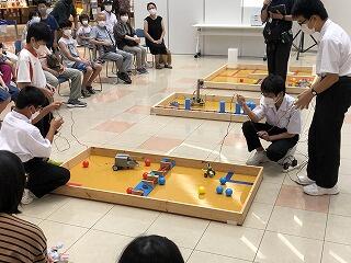 本校の生徒は多くのお客さんを前にして、緊張しながらも、自作のロボットの紹介や秋に行われるロボコン大会のデモンストレーションを行いました。