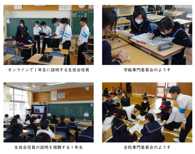 本日12日(金)の午後は、生徒会主催の専門委員会オリエンテーションでした。Google meetで1年生に向けて、学級専門委員会及び全校専門委員会について説明を行い、各クラスで学級専門委員会を行ったあと、各委員会の長が体育館に集合して全校専門委員会を行いました。