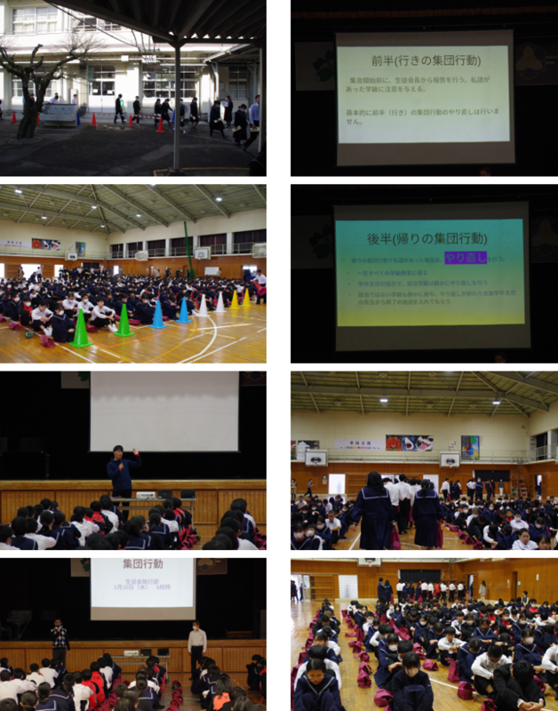 1月10日(水)5校時、生徒会執行部による集団行動を実施しました。生徒会長による全校放送の合図で、体育館まで無言で移動した後、新名先生から集団行動における留意点、生徒会顧問の押領司先生と生徒会長から集団行動の大切や本校における集団行動の約束事について、Googleスライドのプレゼンを利用して確認しました。