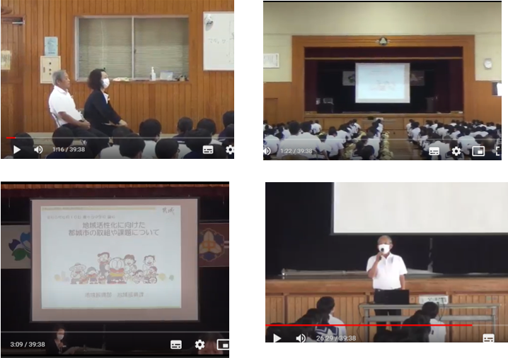 6月16日(金)午後、3年生の総合的な学習の時間に都城市地域振興課の種子田主幹及び妻ケ丘地区まちづくり協議会の堀川会長をお呼びし、お二人に地域活性化に向けた都城市及び妻ケ丘地区の取組や課題について説明をしていただきました。