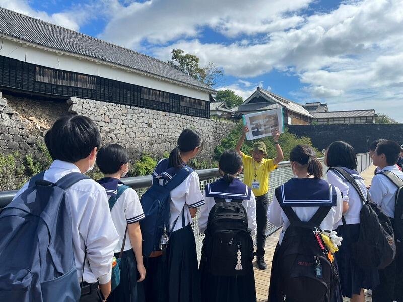 生徒たちは、熊本城が修復中の様子を見学しながら、その歴史についても熱心に勉強していました。