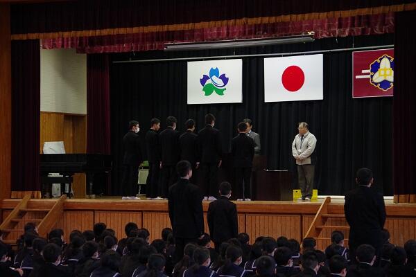 本日より3学期がスタートしました。各学年および生徒会代表による新学期の抱負、校長先生のお話、校歌斉唱、表彰、新任者紹介などを行った後、服装容儀検査を実施しました。