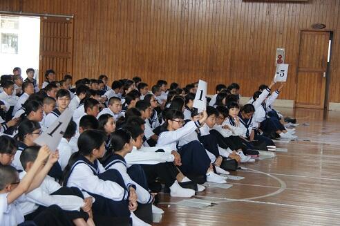 本日5、6校時は、本校体育館にて生徒総会が開かれました。この日を迎えるまでに学級討議やしおり作成、当日の運営など、生徒会役員を中心に全校生徒で尽力してきたことが活かされた素晴らしい議論の場となりました。生徒会スローガンの提案や専門委員会報告、会計報告が行われた後、よりよい学校にするための要望、中心議題では、どの学級からもプラカードが掲げられ、活発な意見交換が行われました。