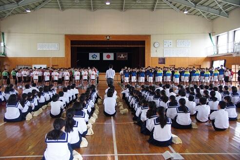 全校集会、表彰、結団式を行い、夏休みの課題点検を行いました。