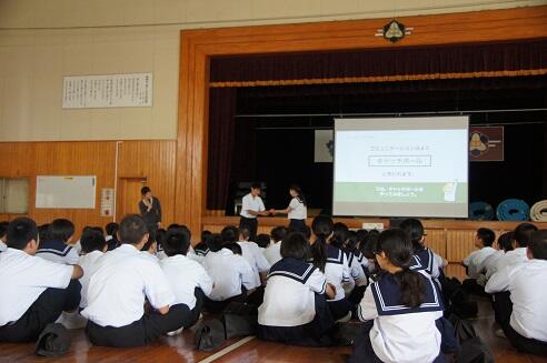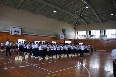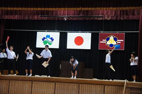 終業式では各学年及び生徒会代表の1学期反省に始まり、学校長の話、校歌斉唱、学習コンクールや学級設営コンクールの表彰などがありました。