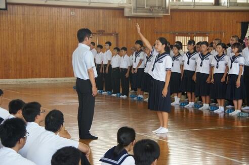 始業式では、代表生徒による2学期の抱負、学校長の話、表彰、諸連絡、服装容儀検査等が行われました。まだまだ暑い日が続きますが、2学期も勉強や学校行事、部活動等に力を入れていきましょう。