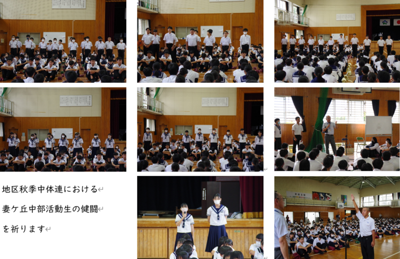 本日午後、県大会に出場する部活動生の推戴式を行いました。各部のキャプテン、部長の決意表明から始まり、校長先生と全校保体委員長からの激励の言葉、選手を代表して柔道部主将の選手宣誓がありました。地区の代表として、妻ケ丘中部活動生の健闘を祈ります。持てる力を十二分に発揮して頑張ってきてください。