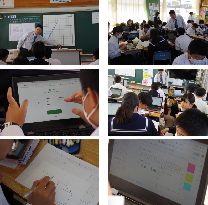 今年度、本校では主体的に自分の考えを伝え、共に学び合う児童生徒の育成~子どもが主役の授業を通して~という研究主題で校内研究を進めています。この日の午後の職員研修は、都城市教育委員会の黒田勝彦指導主事を講師にお招きして、複線型授業についての研修を行いました。過去と比較した現在の世界における日本経済の動向から話が始まり、グローバル化・少子高齢化・ICTの進展・多様性などめざましく変化する今の世の中において、子どもが主役の授業=効果的な複線型授業の在り方についてご講義いただきました。気になった言葉や思ったこと、感じたこと、考えたこと、これからこんなことに挑戦してみたいなど、さまざまなつぶやきをGoogleチャットを活用して行いました。
