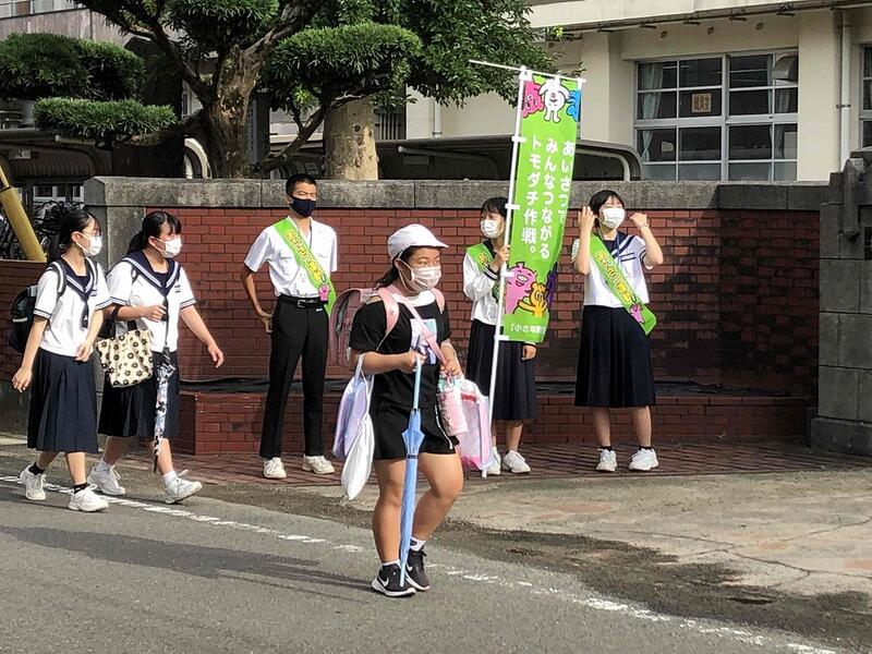 朝のあいさつ運動を実施しました。のぼり旗やたすきを活用して、笑顔で挨拶することができました。