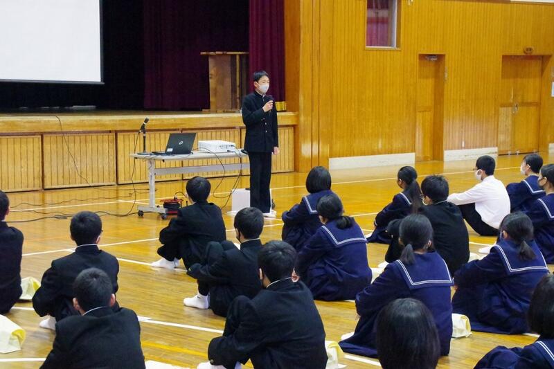 コロナウイルス感染拡大防止の観点から、体育館会場と教室をリモートで繋ぐ形式で行いました。